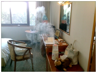 「ほ~い、何でしょう??」なんてすっとぼけてドアを開けると、鈴木の部屋の前を通りかかってドアの下からモクモクと白い煙は出てるわ、なんだか燃えている香りがするわで何事かとびっくりしたスタッフが立っていた。