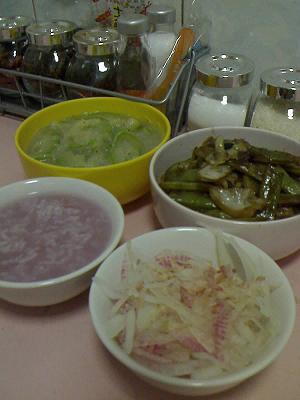 夜 <家>赤大根のお粥、たまねぎサラダ、冬瓜と春雨のスープ、キャベツとたまねぎ炒め
