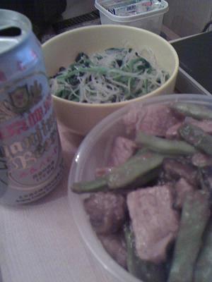 夜 <家>ほうれん草と春雨のサラダ、豚肉とインゲンの煮込み、ビール