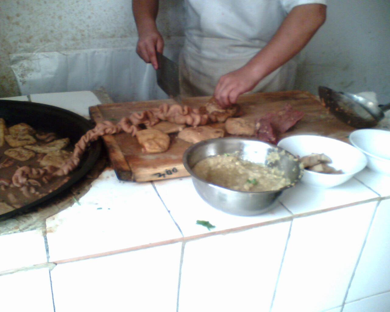 大きな鍋でぐつぐつ煮込まれた胃や腸たち。
